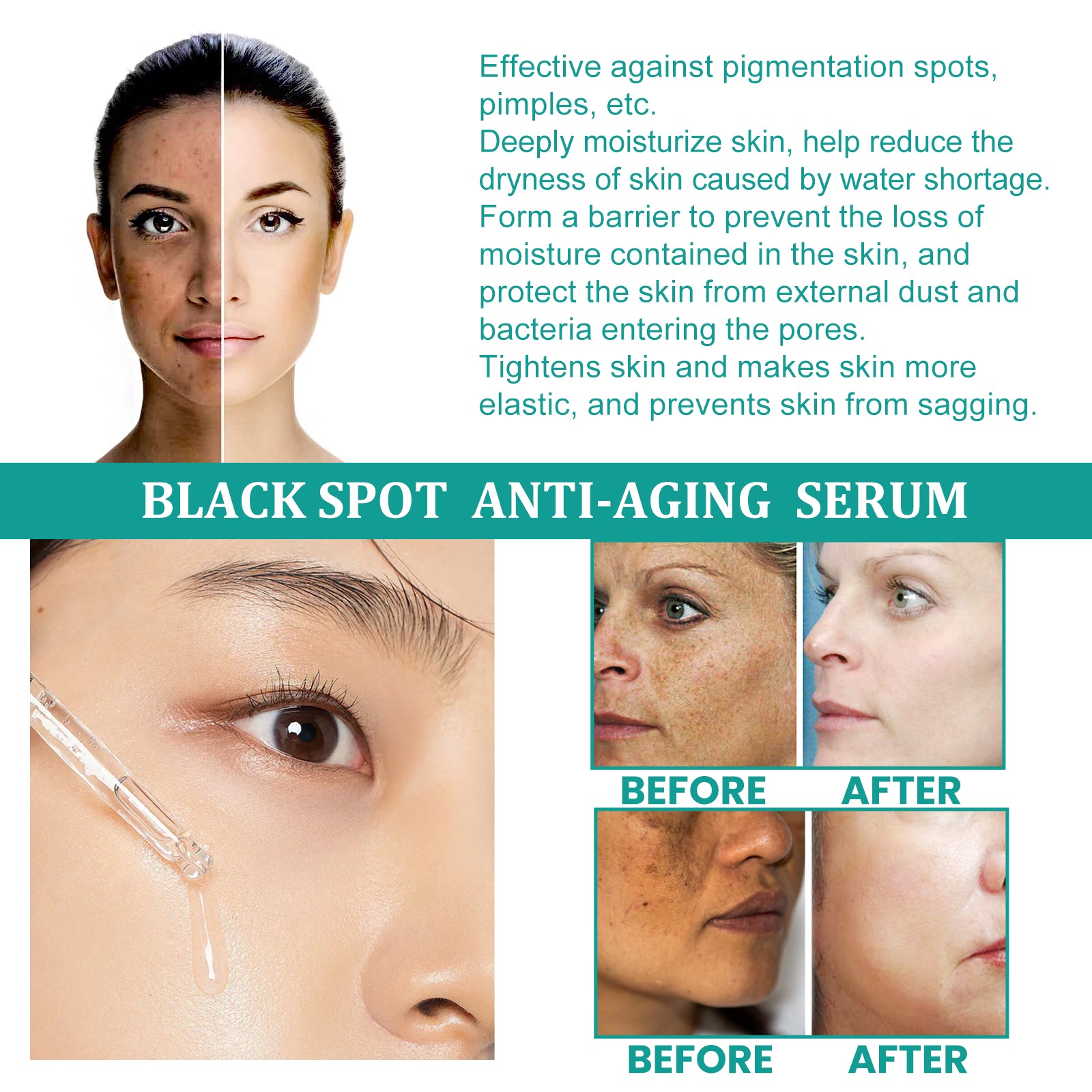 Tinh chất chống lão hóa dành cho vết thâm nám của chúng tôi chứa chiết xuất trà xanh và vitamin C. Sản phẩm có thể hiệu quả chống lại các vết nám, mụn trứng cá, v.v... Nó dưỡng ẩm sâu cho da và giúp giảm khô da do thiếu nước. Tạo lớp màng bảo vệ để ngăn ngừa sự mất nước trong da và bảo vệ da khỏi bụi bẩn và vi khuẩn bên ngoài xâm nhập vào lỗ chân lông. Cách sử dụng rất đơn giản: Sau khi làm sạch da, lấy một lượng sản phẩm vừa đủ thoa lên lòng bàn tay. Thoa một lớp mỏng tinh chất lên da mặt và vỗ nhẹ nhàng khắp khuôn mặt để giúp hấp thụ tốt hơn. Đồng thời giúp làm săn chắc da, tăng độ đàn hồi và ngăn ngừa chảy xệ.