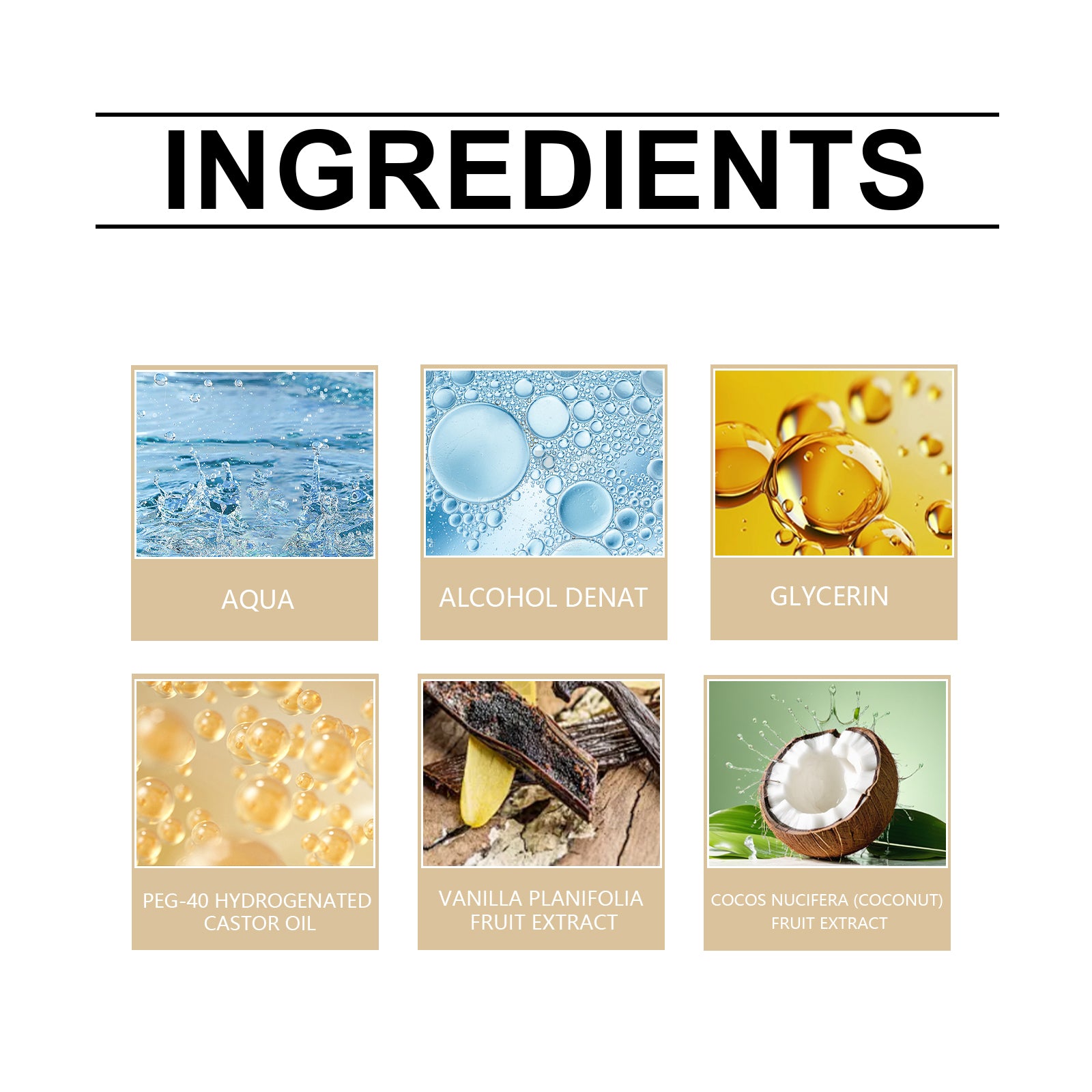 Our Vanilla Coconut Body perfume spray is carefully formulated with glycerin and PEG-40 hydrogenated castor oil. Designed for a long-lasting fragrance, it exudes an alluring aroma throughout the day. The usage method is extremely convenient: Open the bottle cap, press the nozzle, and spray the product onto the hair, neck, wrists or other parts of the body. And it has a vanilla flavor, bringing fresh and creamy flavors; The coconut aroma is warm and charming, enhancing personal charm.