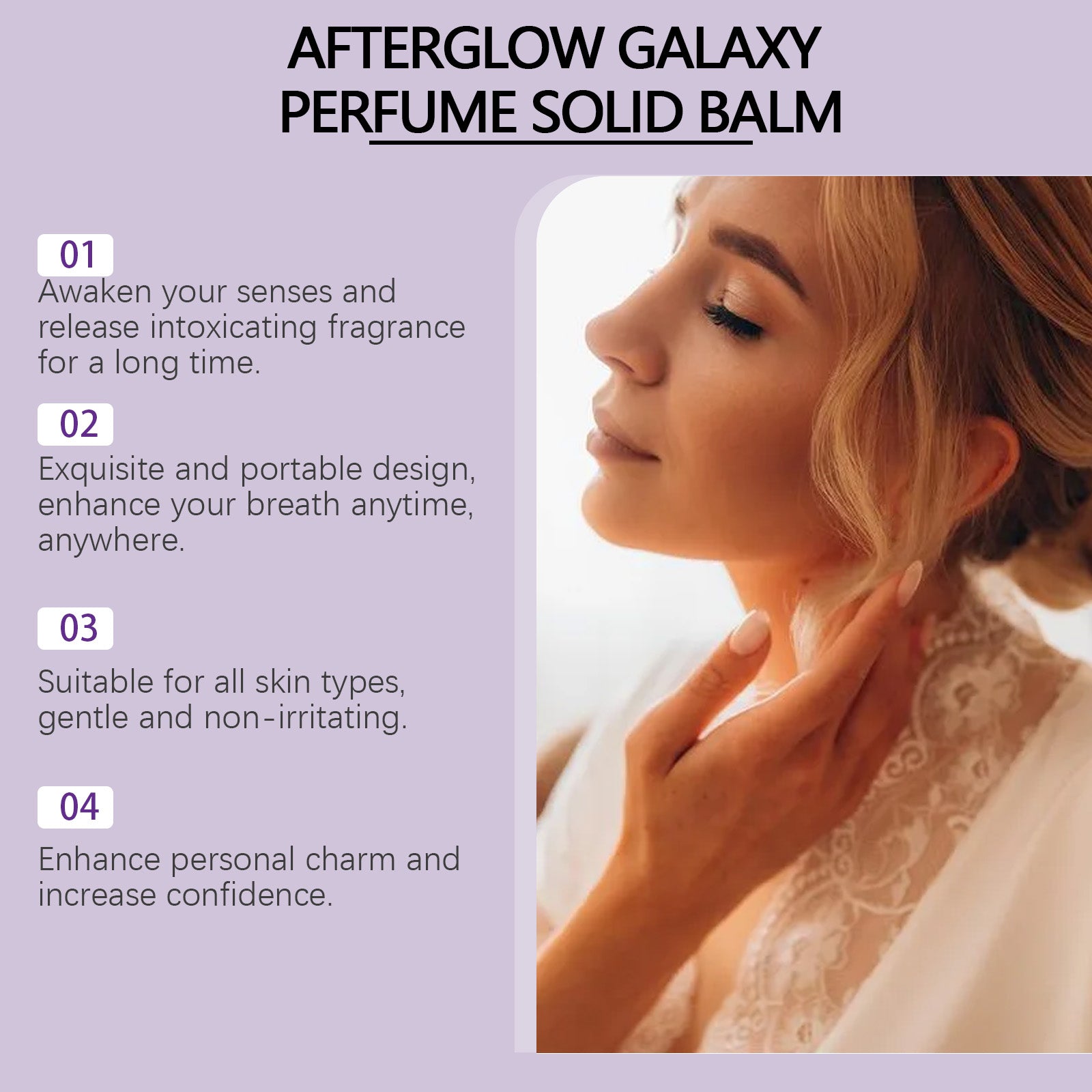 Our lavender scented solid balm contains mineral oil and white beeswax. It can create beautiful fragrances every day. Compact design for anytime, anywhere use. Its use is simple: open the lid of the balm box, take the appropriate amount of balm, and apply it to the inside of the wrist, the back of the neck, or behind the ears where there is a significant pulse. Gently massage the applied area with your fingertips to evenly coat the balm. And can be delicate packaging, suitable for various occasions.