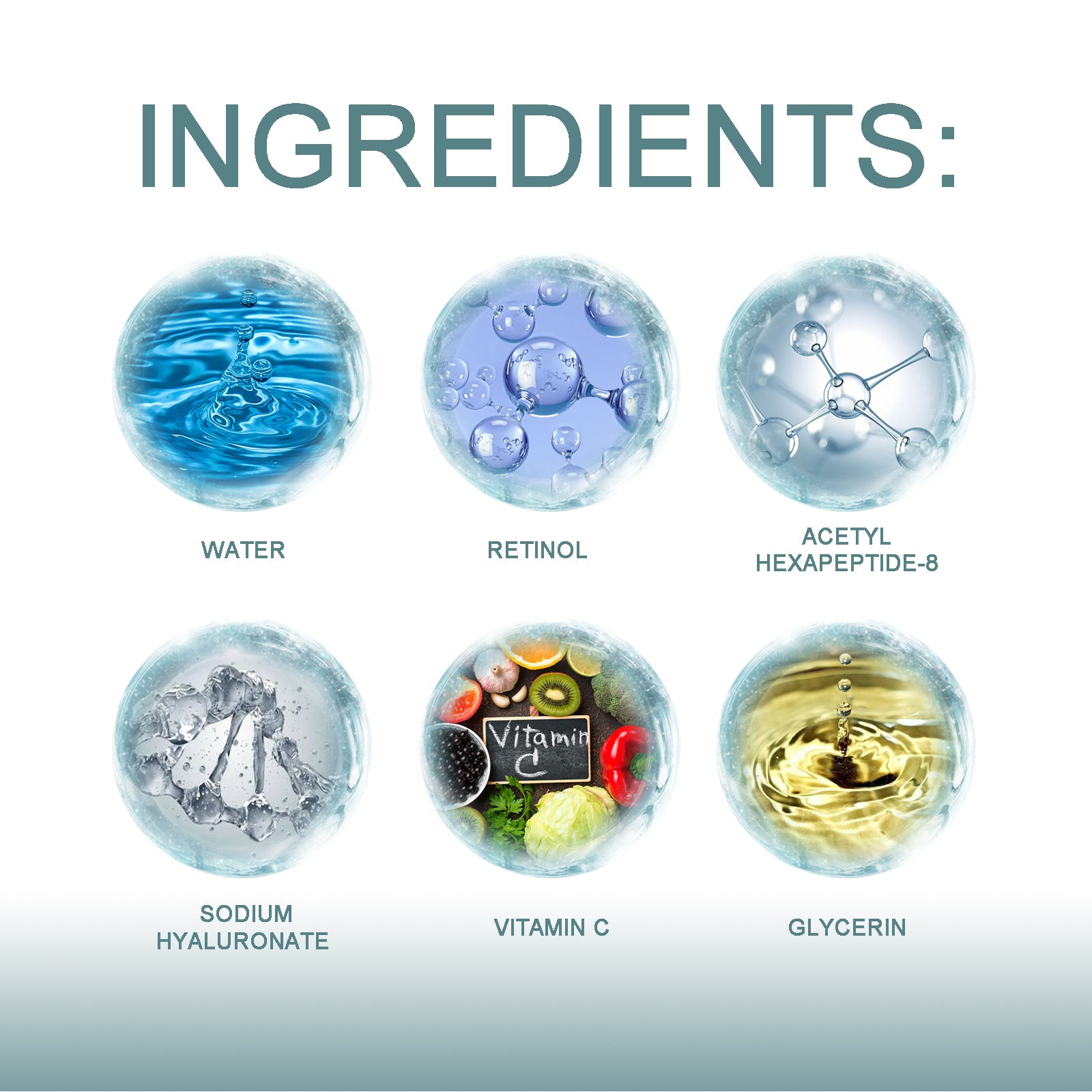 Our retinol serum contains retinol, acetyl hexapeptide-8. It reduces blemishes and pimples and moisturizes the face. Its use method is very simple: after cleansing and conditioning, take appropriate amount of essence evenly apply on the face, gently massage with your hand in circles, let it absorb. And can be suitable for all types of skin, suitable for moisturizing the eye area, neck, hand skin, etc., to make the face more youthful.
